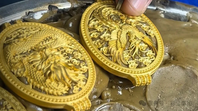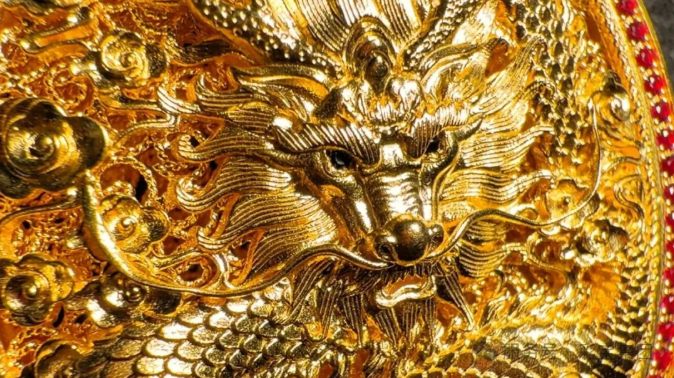 浮雕錾刻让平面金属“立”起来。匠人需运用上百种不同形状的錾子,在黄金表面敲击数十万次。每一錾的力度、角度,都关乎最终效果。