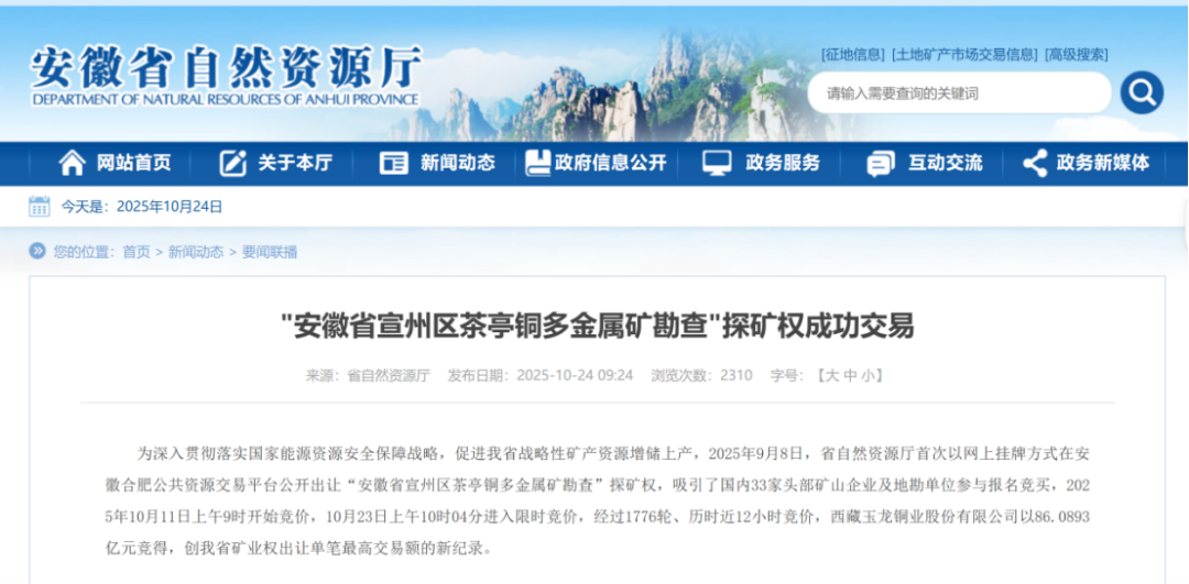 9月8日,安徽省自然资源厅首次以网上挂牌方式在安徽合肥公共资源交易平台公开出让“安徽省宣州区茶亭铜多金属矿勘查”探矿权,吸引了国内33家头部矿山企业及地勘单位参与报名竞买,10月11日上午9时开始竞价,10月23日上午10时04分进入限时竞价,经过1776轮、历时近12小时竞价,西藏玉龙铜业股份有限公司以86.0893亿元竞得,创安徽省矿业权出让单笔最高交易额的新纪录。