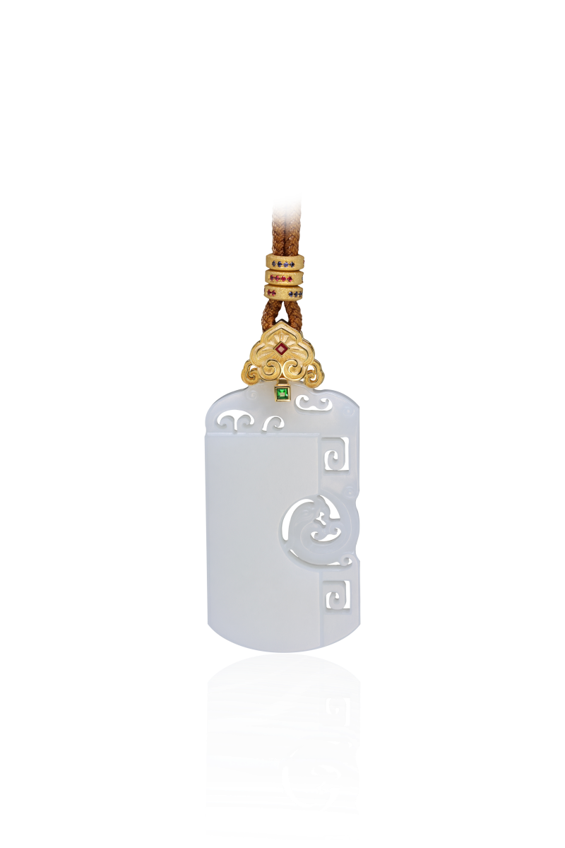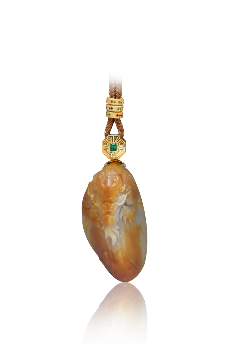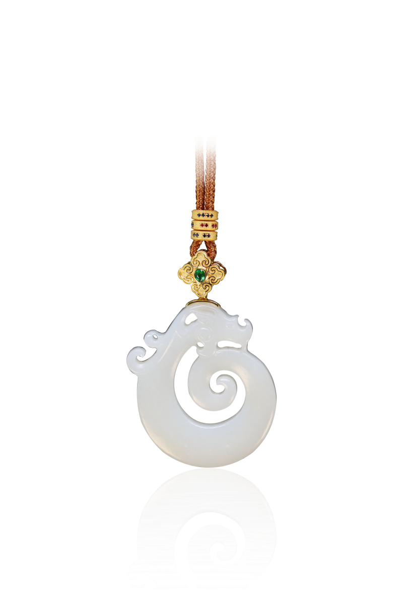 玉魄雕龙溯古今,翠嵌如意佑天心;一坠垂襟藏瀚海,山河皆作掌中吟。